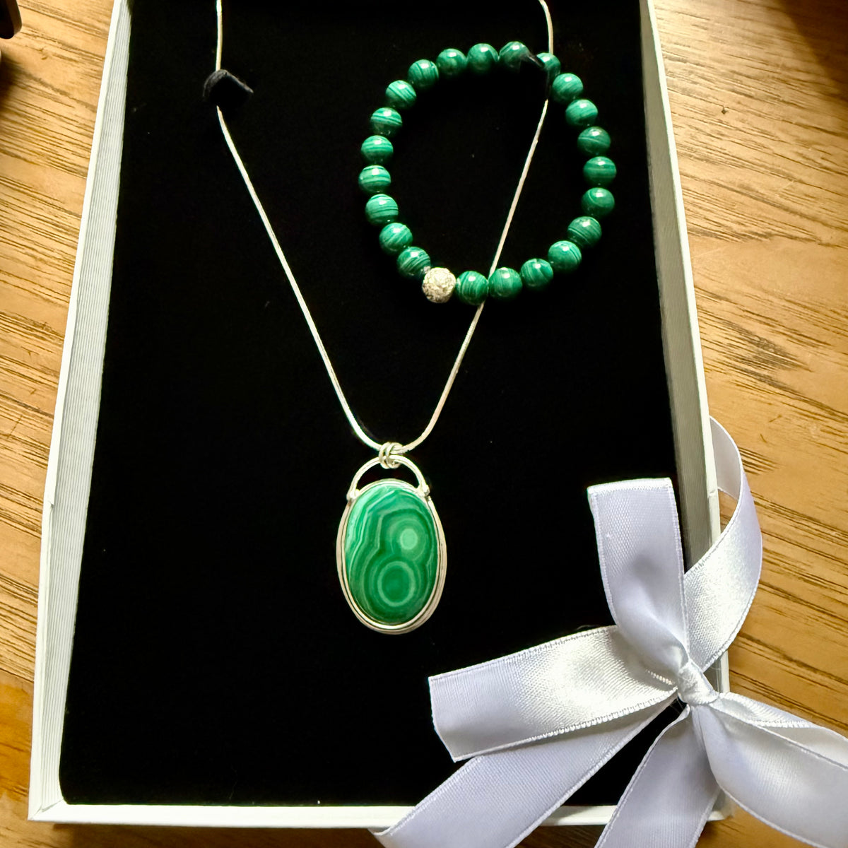 "Green Goddess" Malachite on Sterling Silver Chain and Natural Malachite Beaded Bracelet