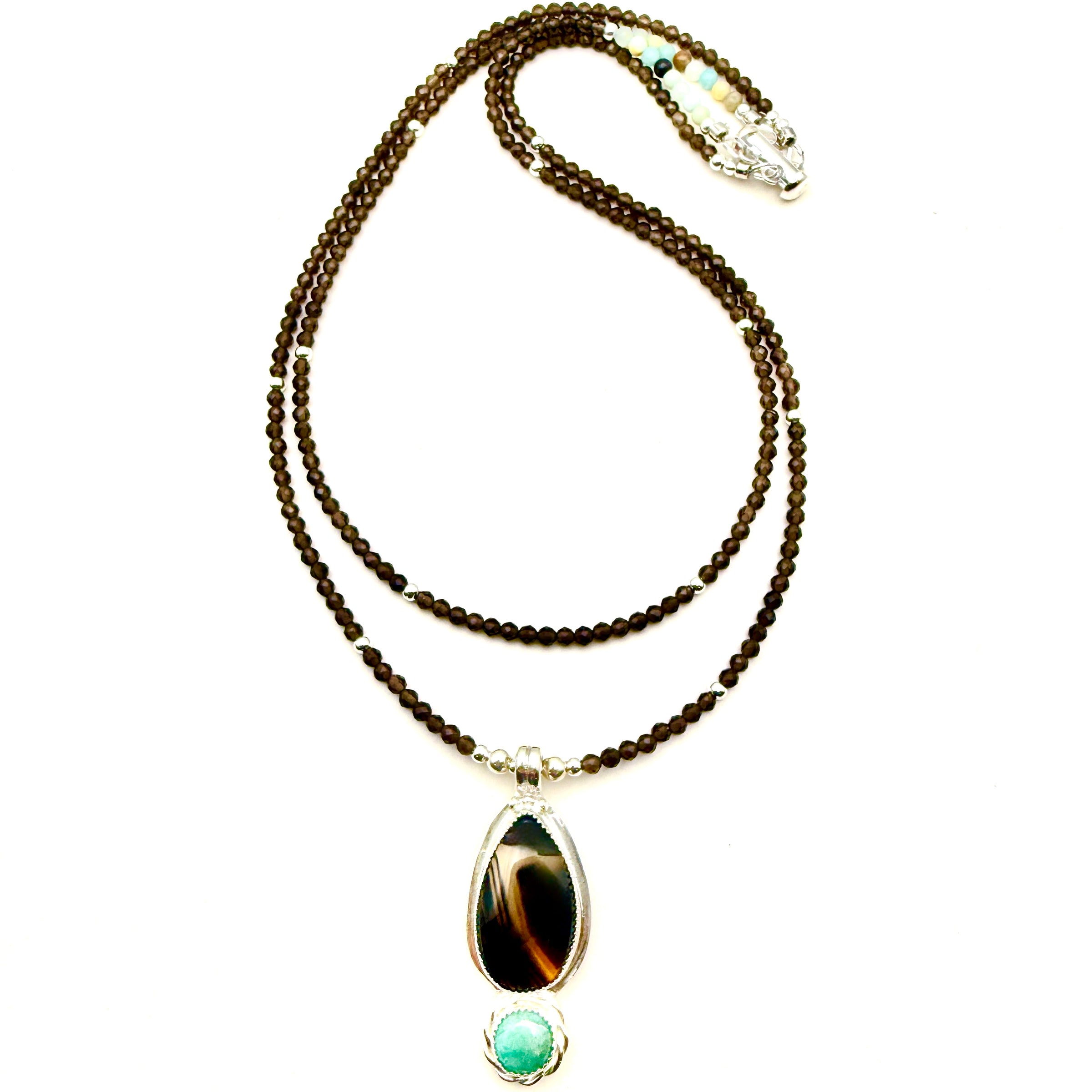 "Lightning Bolt of Inspiration" 2" Montana Agate and Amazonite Pendant on 18" and 15" double-strand beaded smoky-quartz necklace